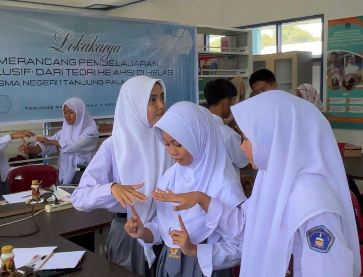 Foto 1: Peserta lokakarya antusias mengikuti sesi diskusi dan praktik merancang pembelajaran di kelas inklusi di Ruang Perpustakaan SMA Negeri 1 Tanjung Palas Tengah.