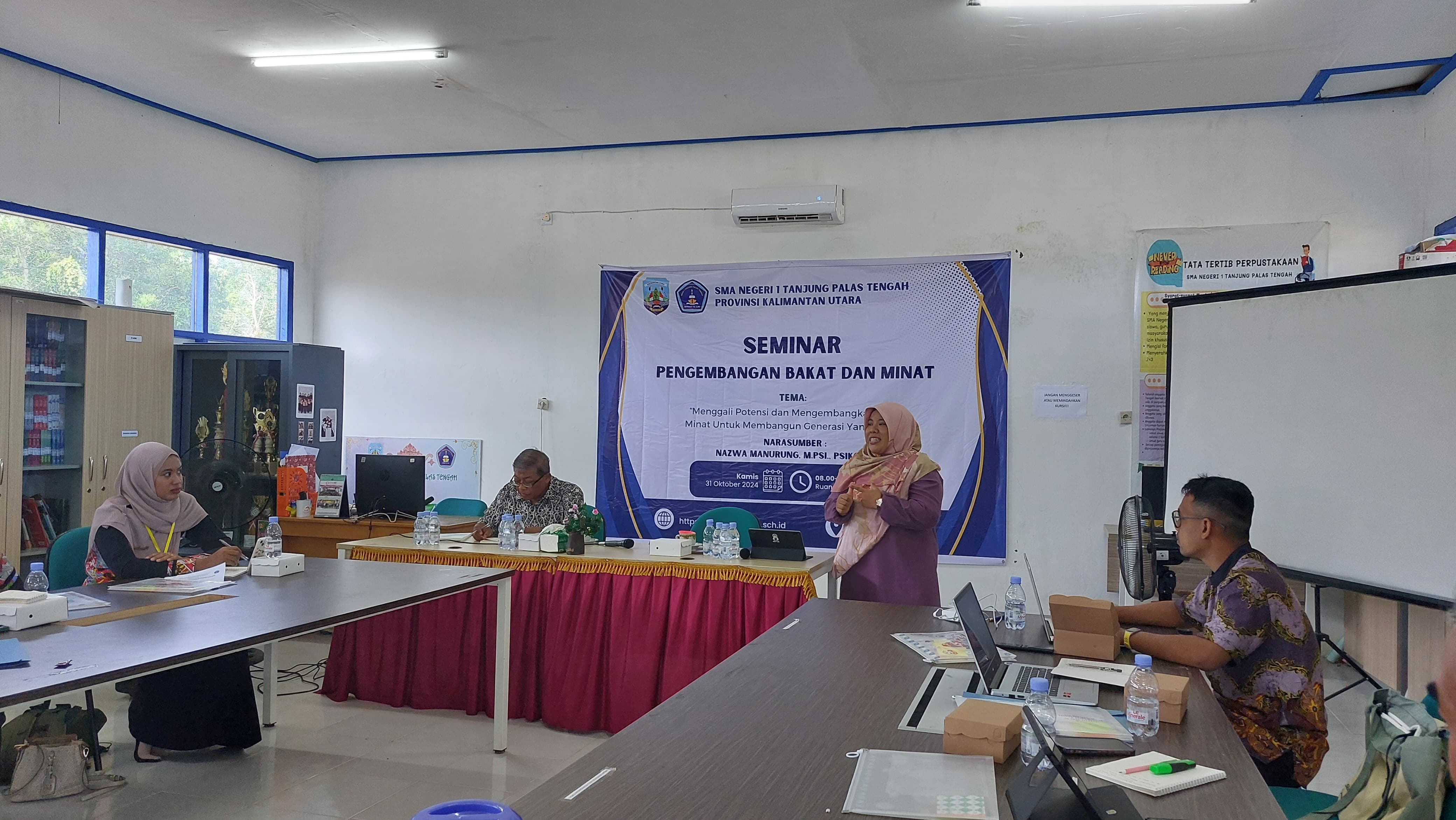 SALIMBATU, 31/10/24. Setiap individu memiliki keunikan dan potensi yang berbeda-beda. Dengan menggali bakat dan minat, kita dapat mengidentifikasi bidang-bidang yang menjadi kekuatan dan kesenangan seseorang. Hal ini akan sangat berguna dalam menentukan pilihan pendidikan, karier, dan pengembangan diri di masa depan. Generasi muda yang memiliki pemahaman yang baik tentang bakat dan minat mereka akan lebih termotivasi dan bersemangat dalam mengejar tujuan hidup mereka. Untuk hal tersebut, pada hari Kamis, 31 Oktober 2024 SMAN 1 Tanjung Palas Tengah mengadakan kegiatan Seminar Pengembangan Bakat dan Minat dengan tema : “ Menggali Potensi dan Mengembangkan Bakat Minat Untuk Membangun Generasi Yang Unggul” dengan Narasumber Najwa Manurung, M.Psi dari Staf Pengajar/Dosen di Universitas Borneo Tarakan. Peserta kegiatan tersebut seluruh Kepala Sekolah dan Dewan Guru. Kegiatan dimulai pukul 08.00 s.d. 14.00 Wita di Ruang Perpustakaan SMAN 1 Tanjung Palas Tengah. Pembiayaan kegiatan Seminar Bakat dan Minat dari BOS Kinerja Prestasi Tahun 2024.