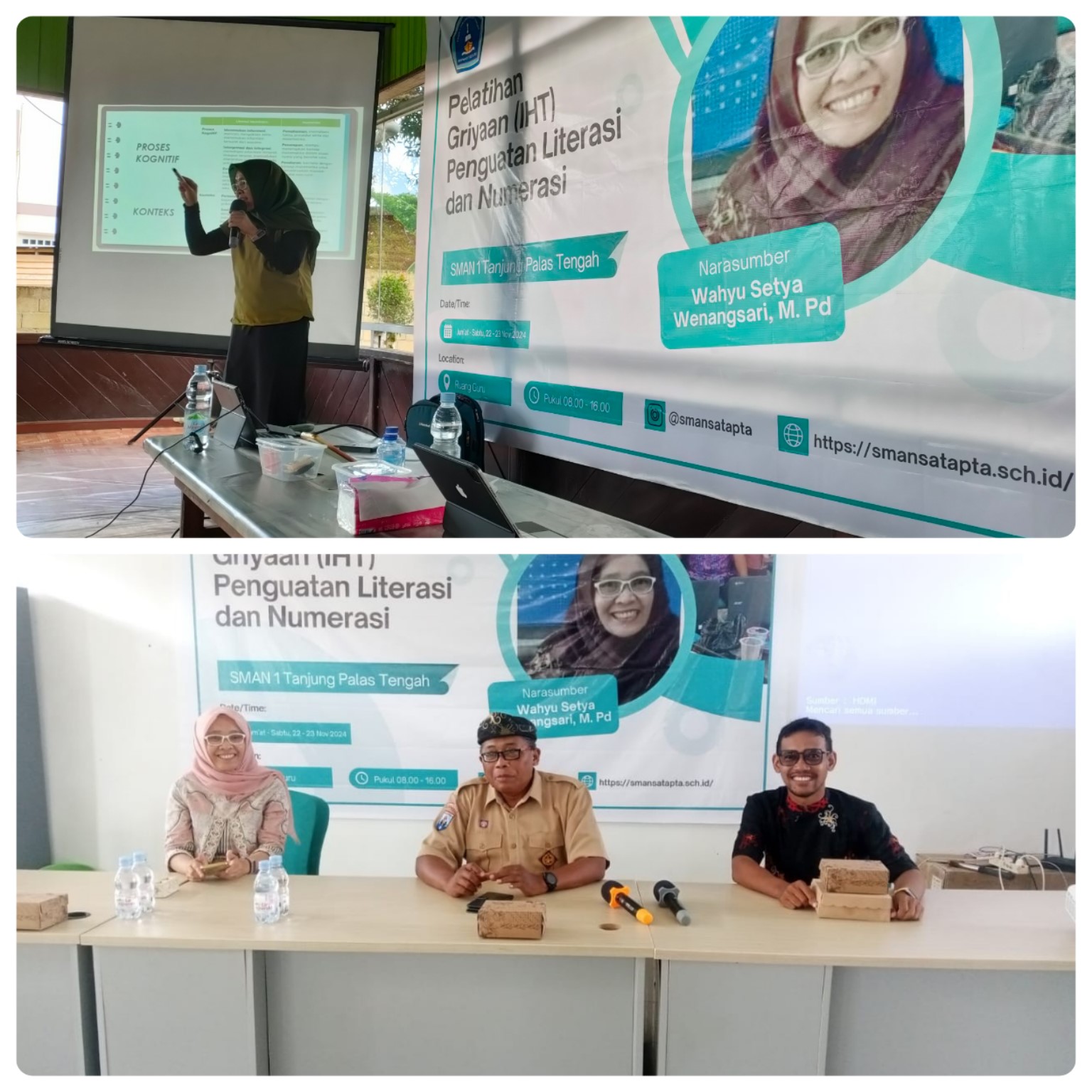 SALIMBATU – 26/11/24. SMA Negeri 1 Tanjung Palas Tengah menggelar kegiatan Pelatihan Griyaan ( IHT ) Penguatan Literasi dan Numerasi Berbasis Deep Learning. Kegiatan dilaksanakan selama 3 (tiga) hari, yaitu 2 (dua) hari secara luring dari tanggal 22-23 Nopember 2024 dan 1 (satu) hari secara daring tanggal 25 Nopember 2024. Peserta dari guru mata pelajaran dan BK. Tempat pelaksanaan hari pertama di Ruang Guru SMAN 1 Tanjung Palas Tengah dan hari kedua di Resto Paharayangan Tanjung Selor, dan hari ketiga secara daring menggunakan Google Meet di Ruang Guru SMAN 1 Tanjung Palas Tengah. Narasumber yang dihadirkan adalah Wahyu Setya Wenangsari, M.Pd. Beliau Guru Inti Nasional, Penulis Soal AKM, Instruktur Kurikulum Merdeka dan Guru SMAN 1 Lawang , Malang. Acara kegiatan Pelatihan Griyaan (IHT) Penguatan Literasi dan Numerasi Berbasis Deep Learning, dibuka oleh Kepala SMAN 1 Tanjung Palas Tengah, Eko Purwanto, M.Pd.