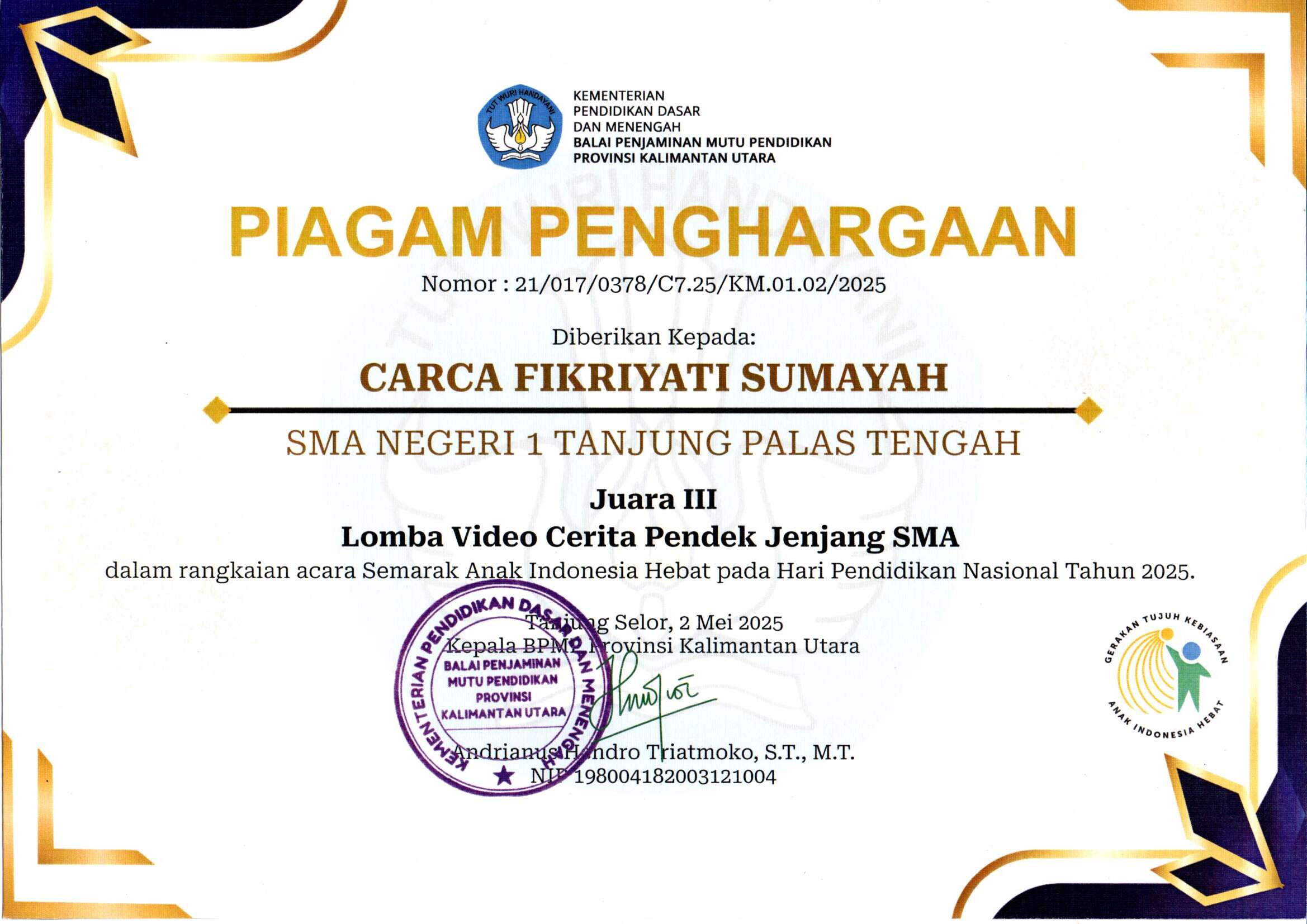 JUARA 3 LOMBA VIDEO CERITA PENDEK/VLOG, A.N. CARCA FIKRIYATI SUMAYAH